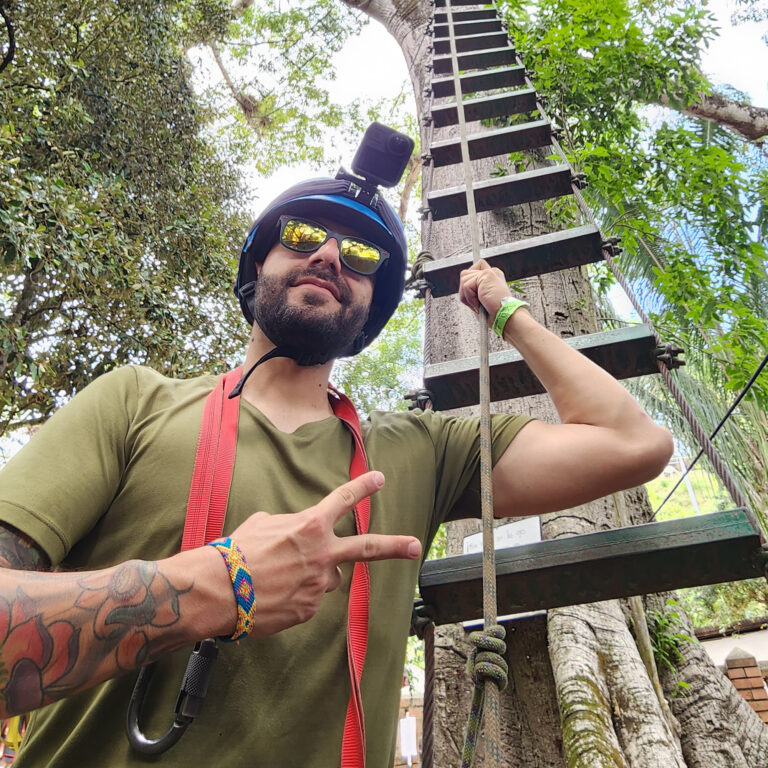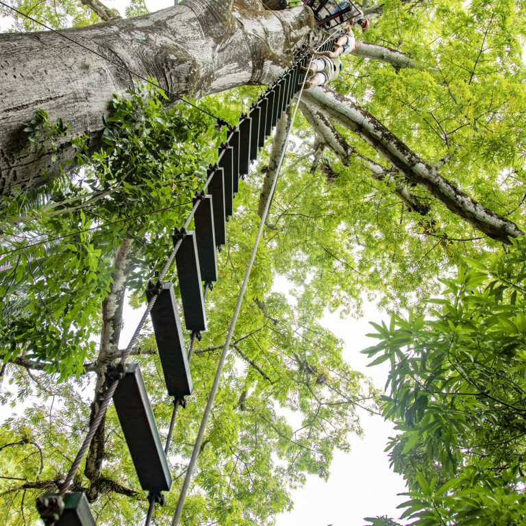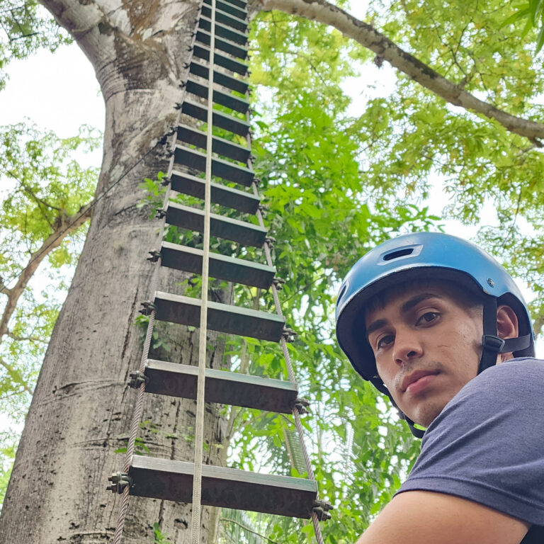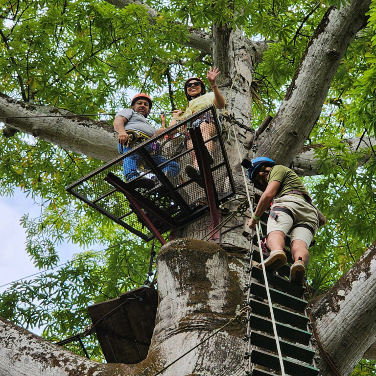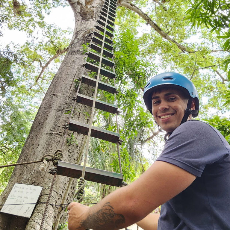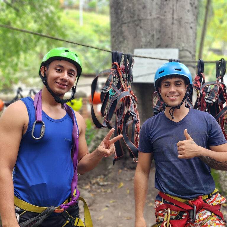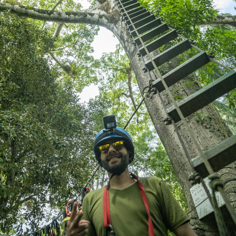 Descenso de mediante una tirolesa entre arboles, circuito donde realizamos 2 vuelos de 180 metros, puente colgante y un rapel al vacío.