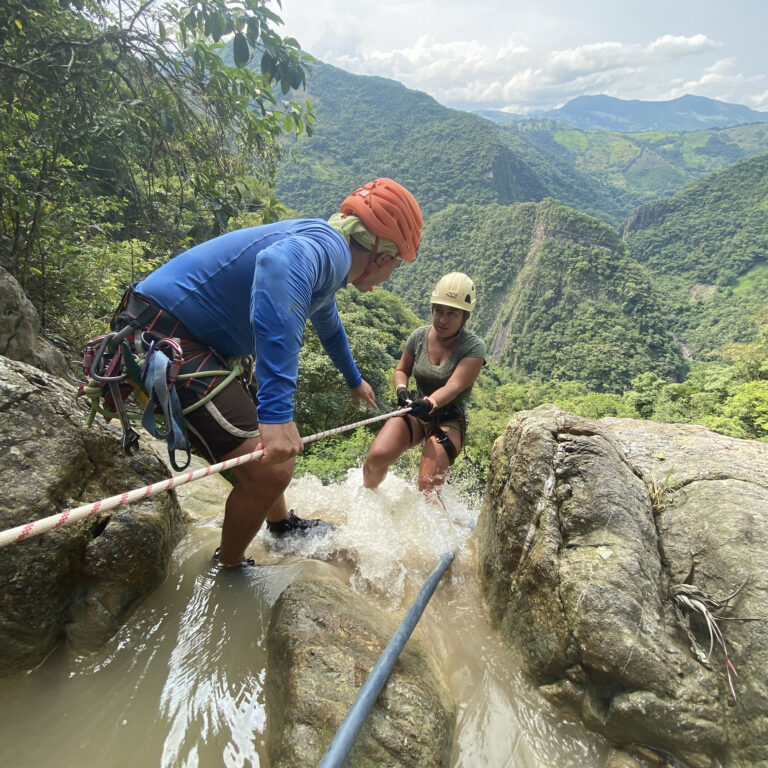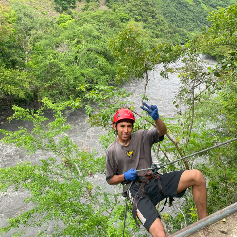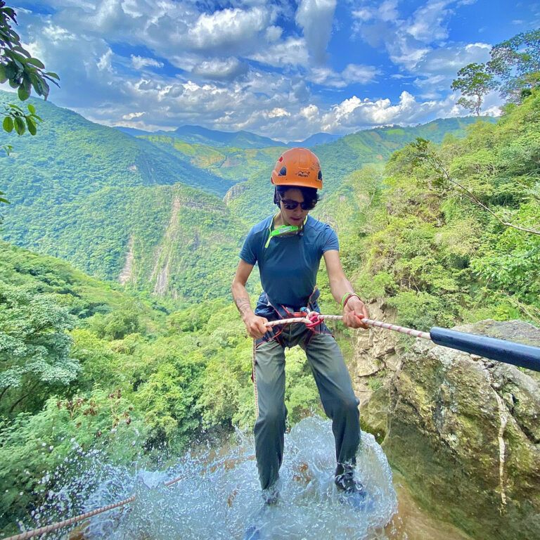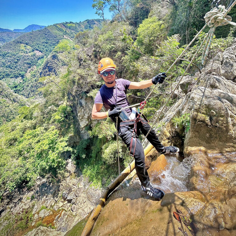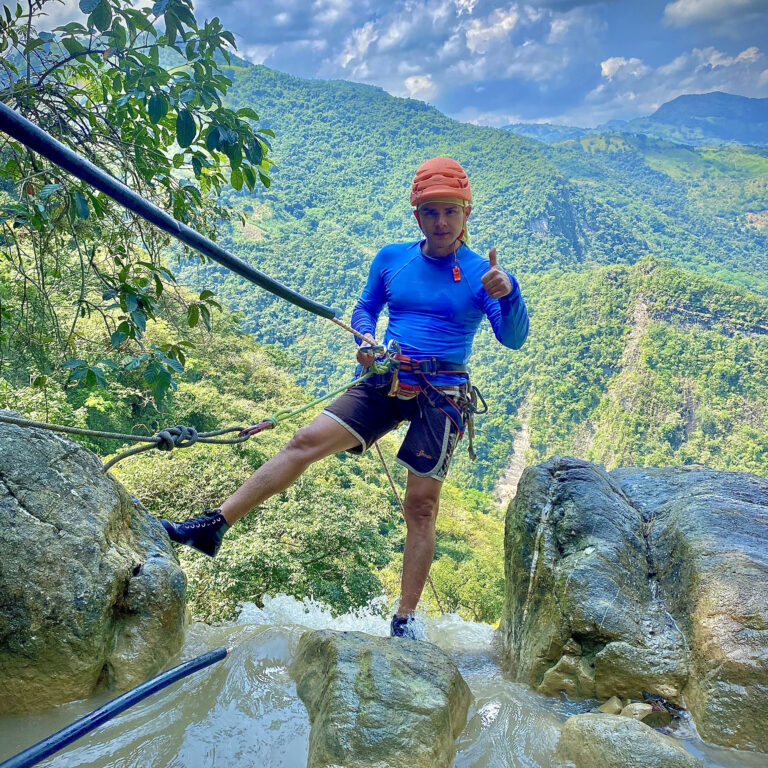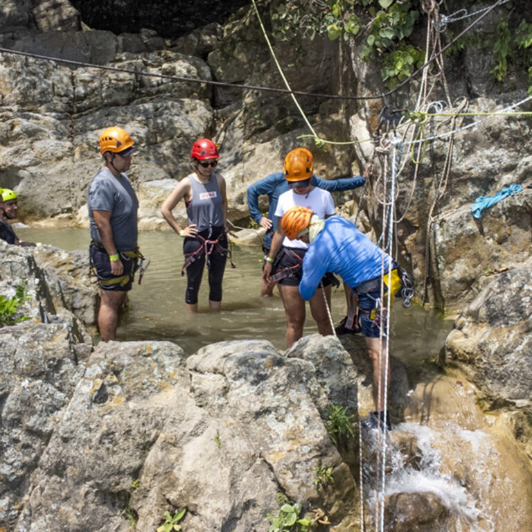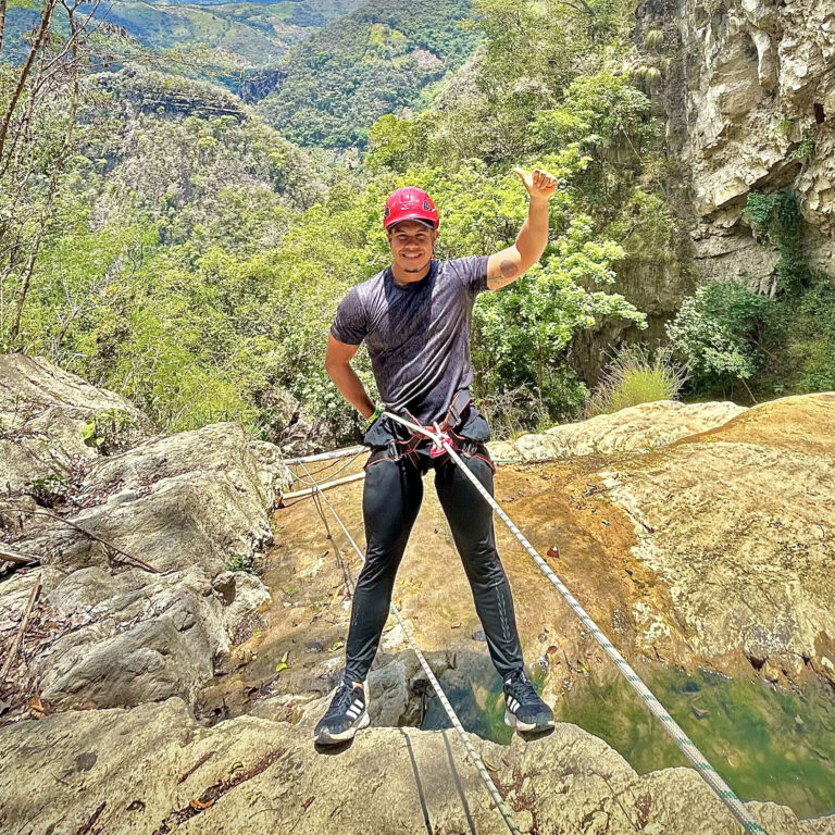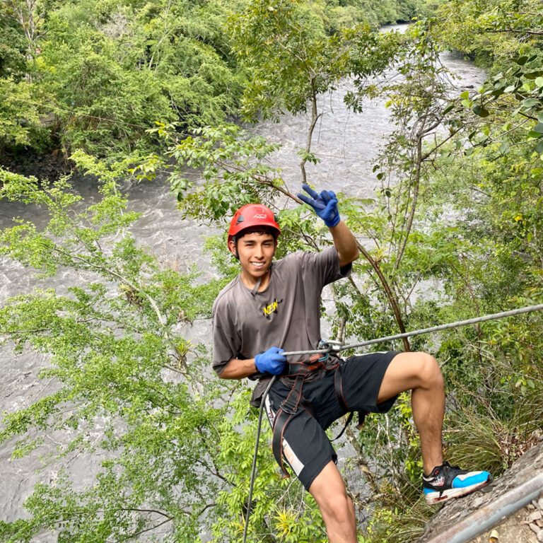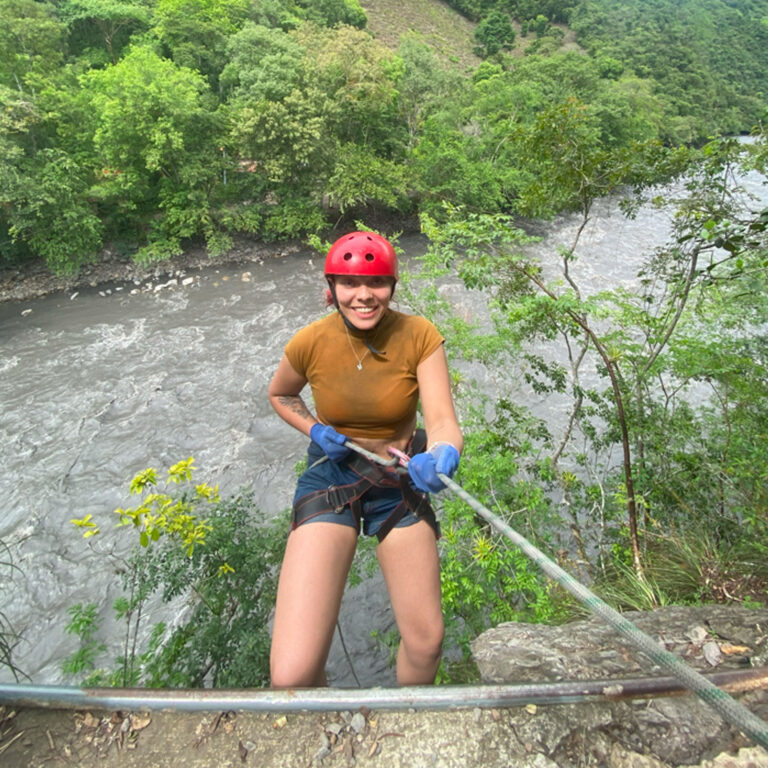 Descender una montaña de 25 metros de altura donde la pata de la montaña queda a la orilla del río teniendo que lanzarse al agua con un chaleco de flotabilidad y equipos de seguridad.