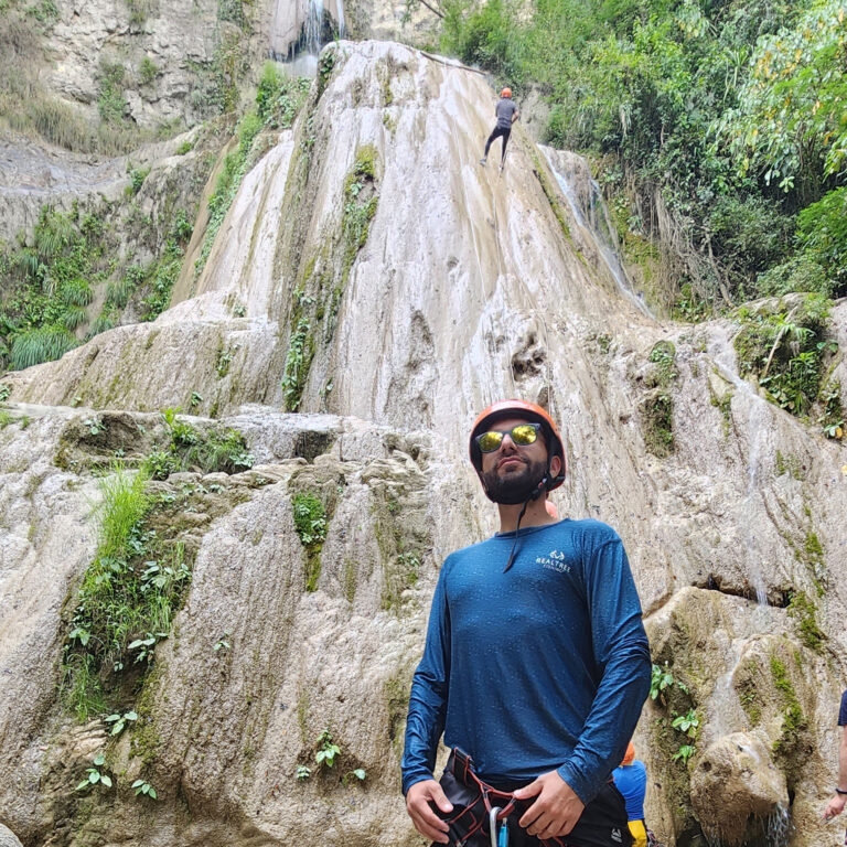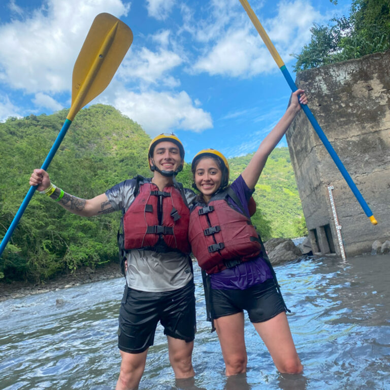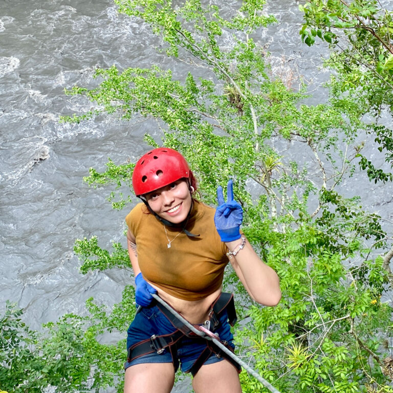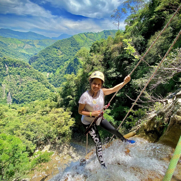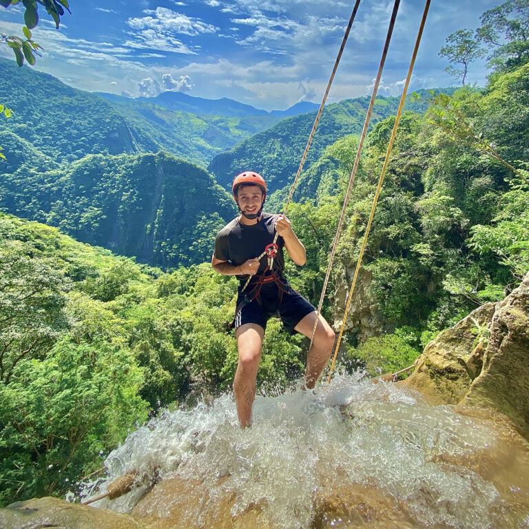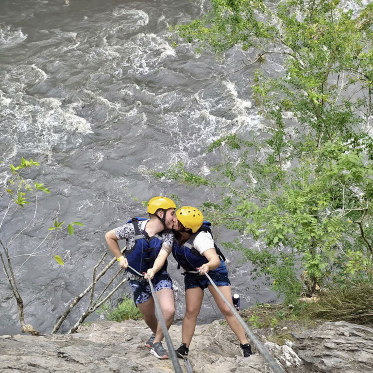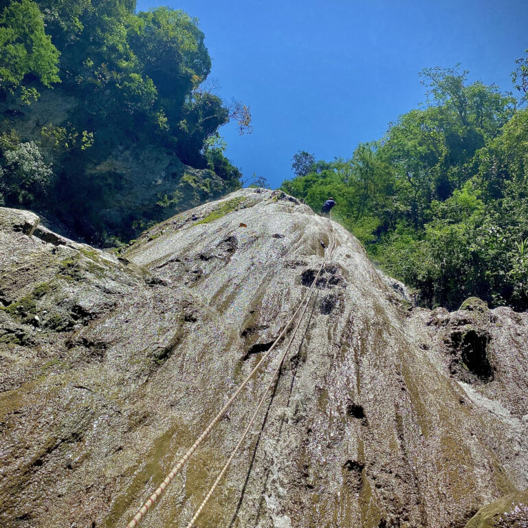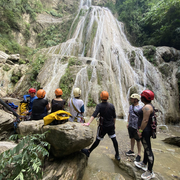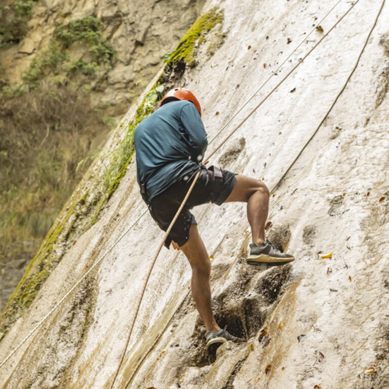 Descender una montaña de 25 metros de altura donde la pata de la montaña queda a la orilla del río teniendo que lanzarse al agua con un chaleco de flotabilidad y equipos de seguridad.