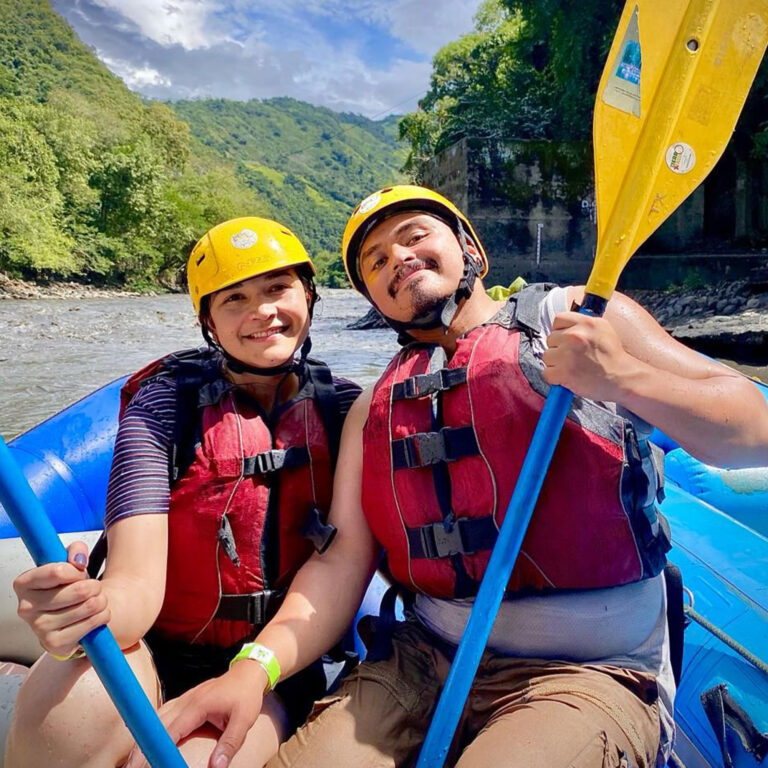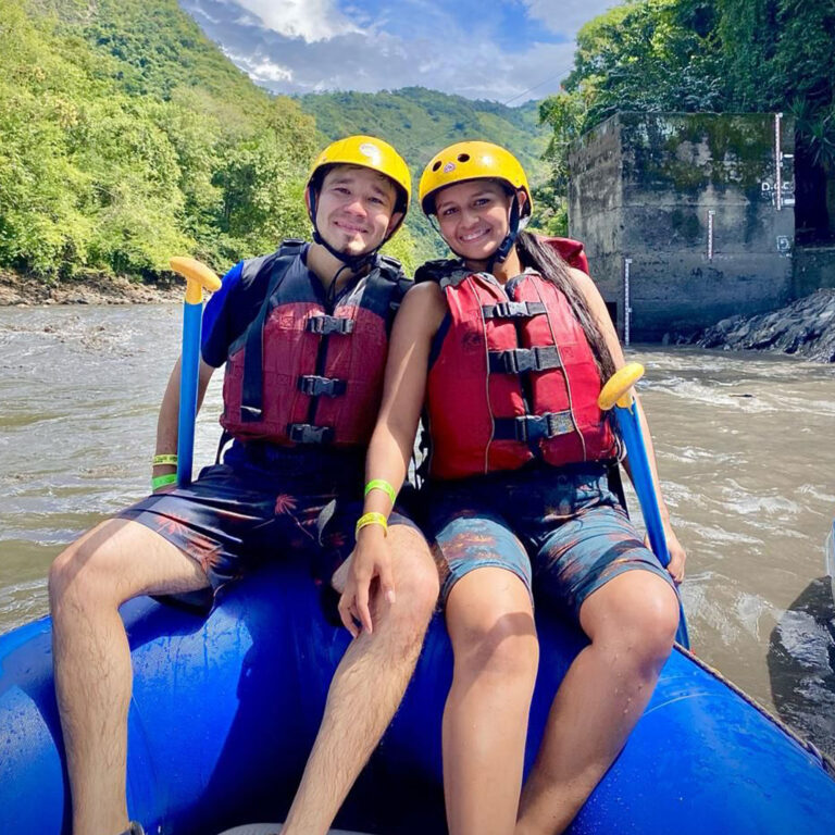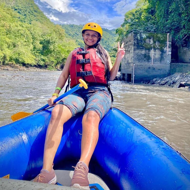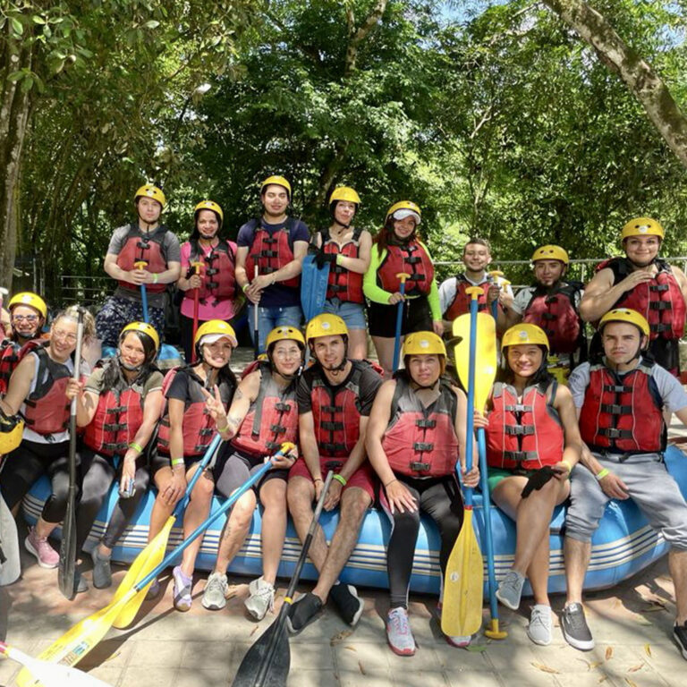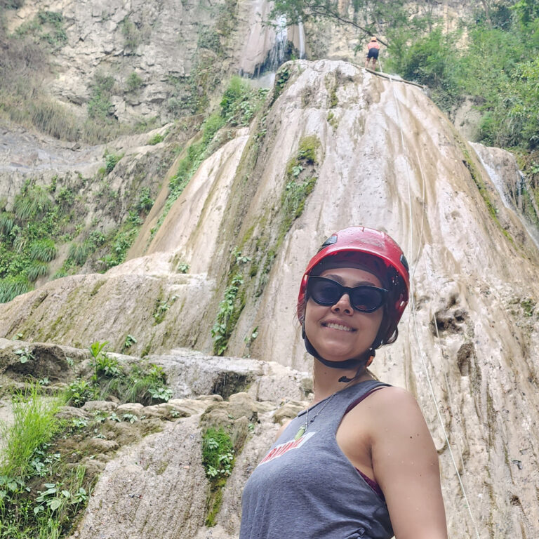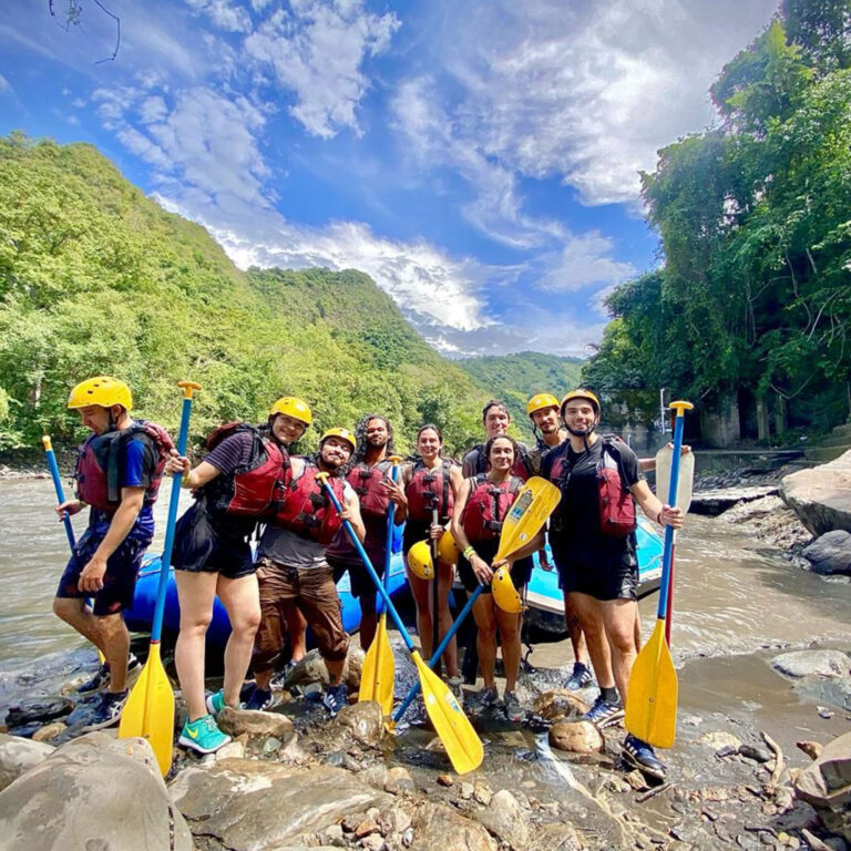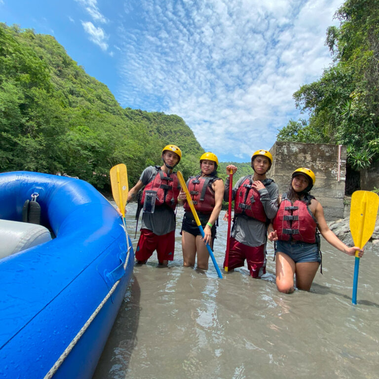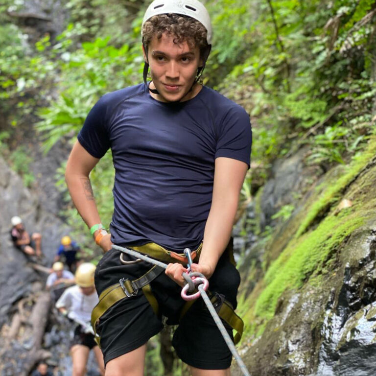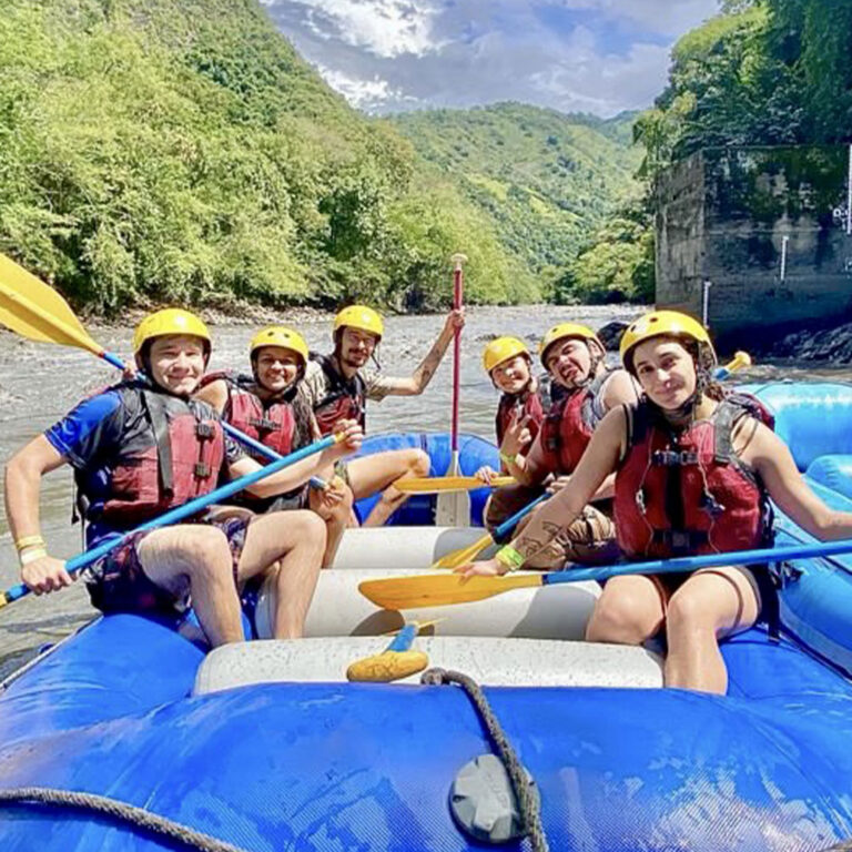 Descender una montaña de 25 metros de altura donde la pata de la montaña queda a la orilla del río teniendo que lanzarse al agua con un chaleco de flotabilidad y equipos de seguridad.